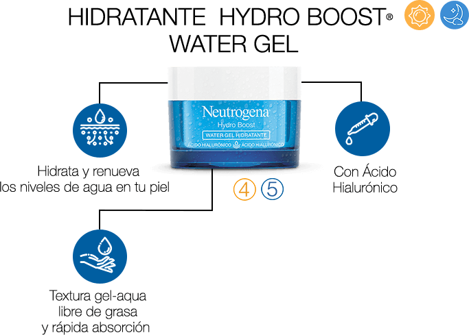 Hidrata y renueva los niveles de agua en tu piel con Neutrogena Hydro Boost® Water Gel y su textura gel - aqua libre de grasa y rápida absorción con Ácido Hialurónico.